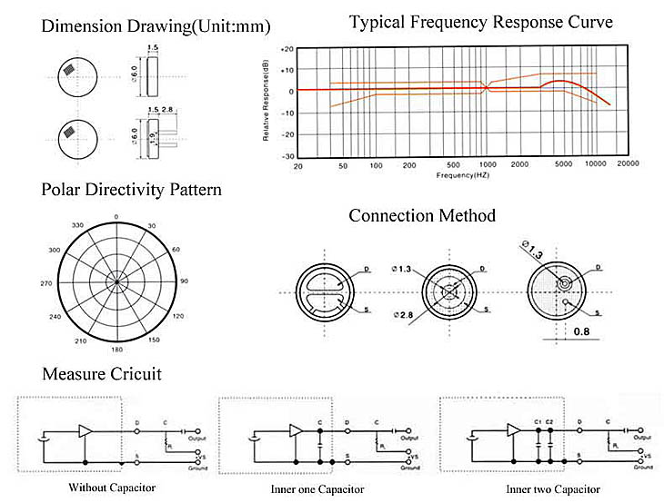| Frequency | 20~16,000Hz | Sensitivity Reduction | Within -3dB at 1.5V |